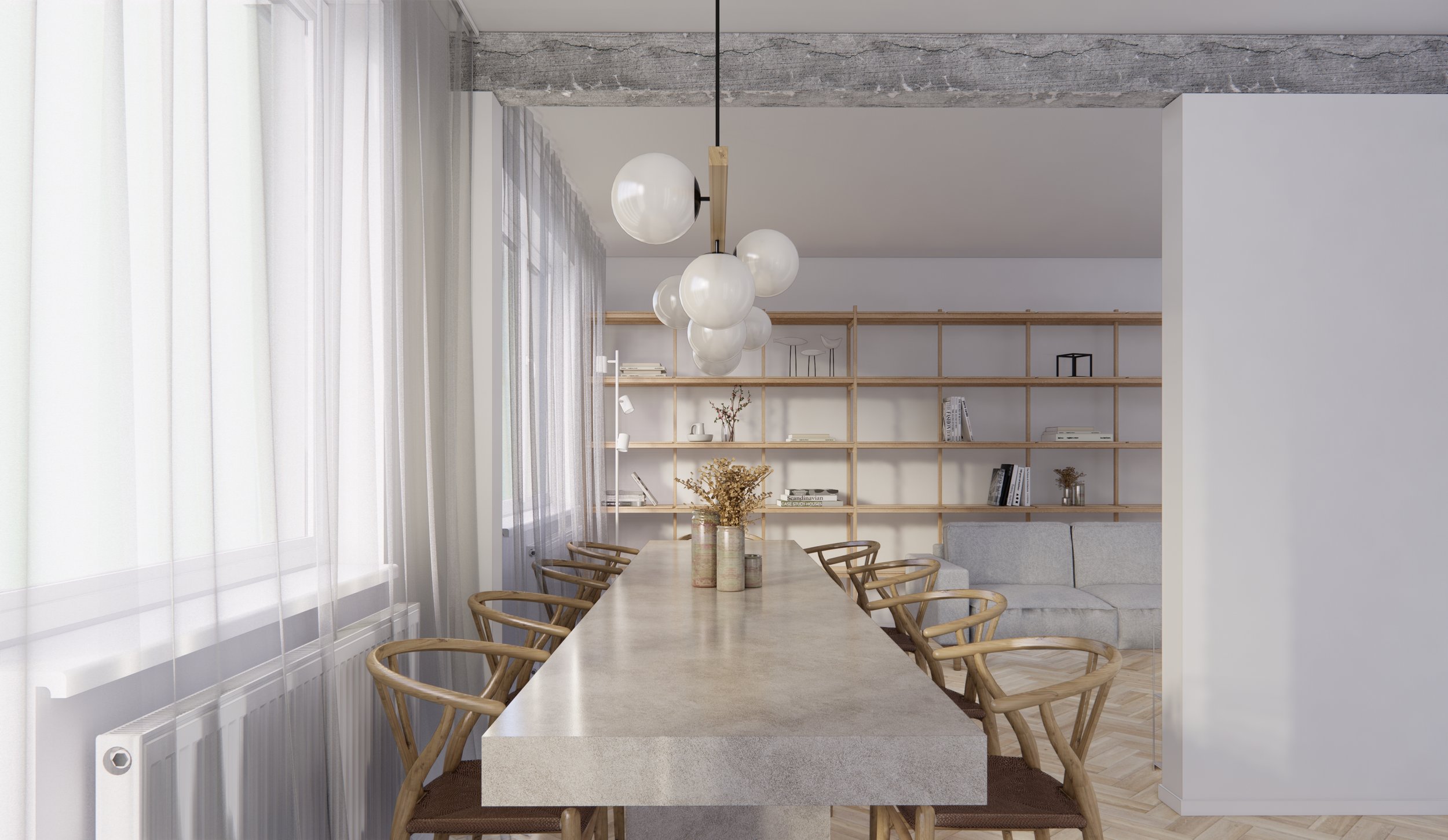 Vzniká vzdušný priestor s masívnym, dlhým stolom - centrom celého bytu.