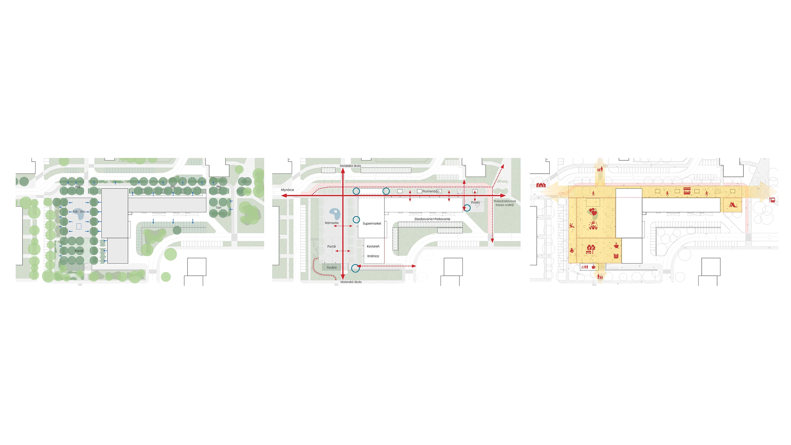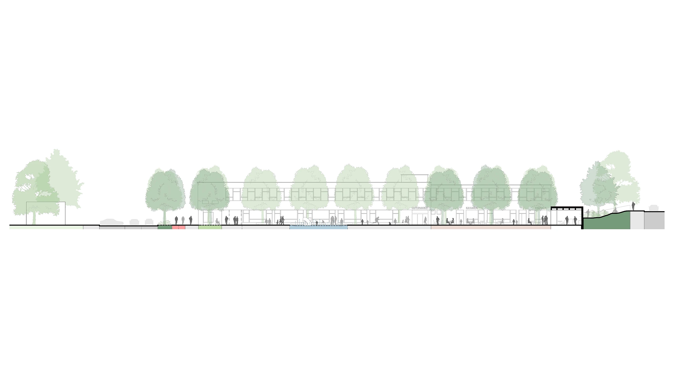 Stromoradie vytvára atraktívnu alej doplnenú o lavičky a odpočinkové zóny v „zelenom“ medzipruhu. V mieste pôvodných verejných toaliet navrhujeme novú aktívnu zónu s hracími prvkami.