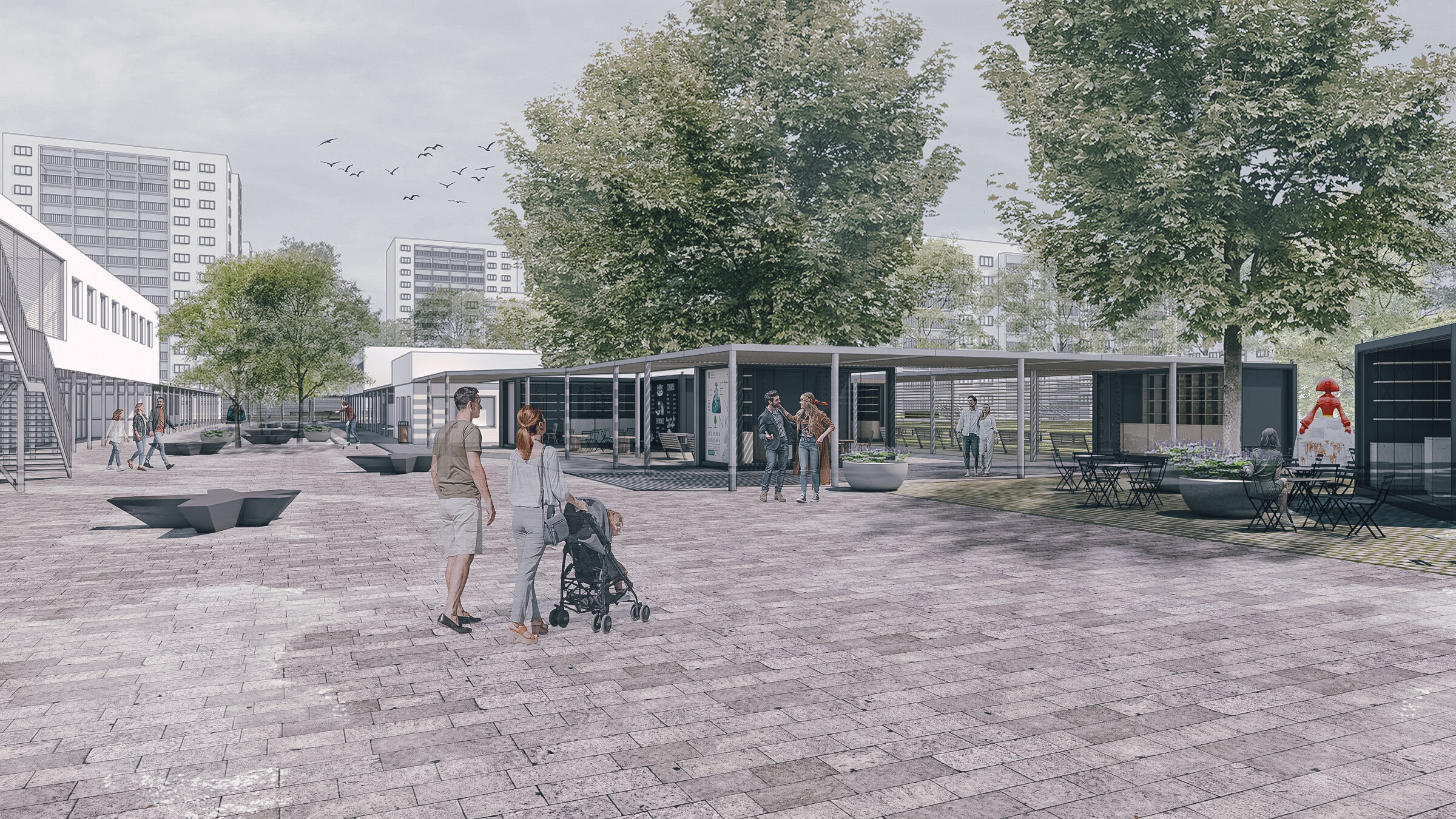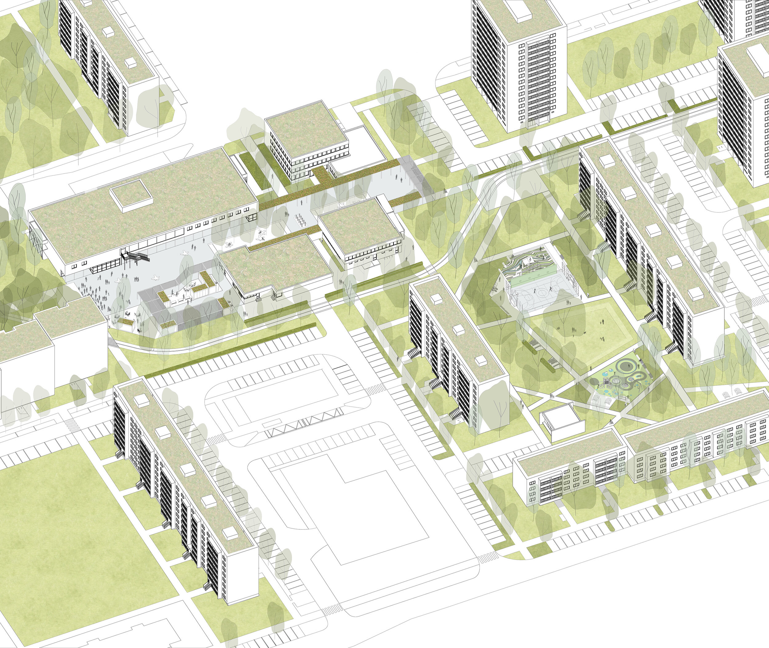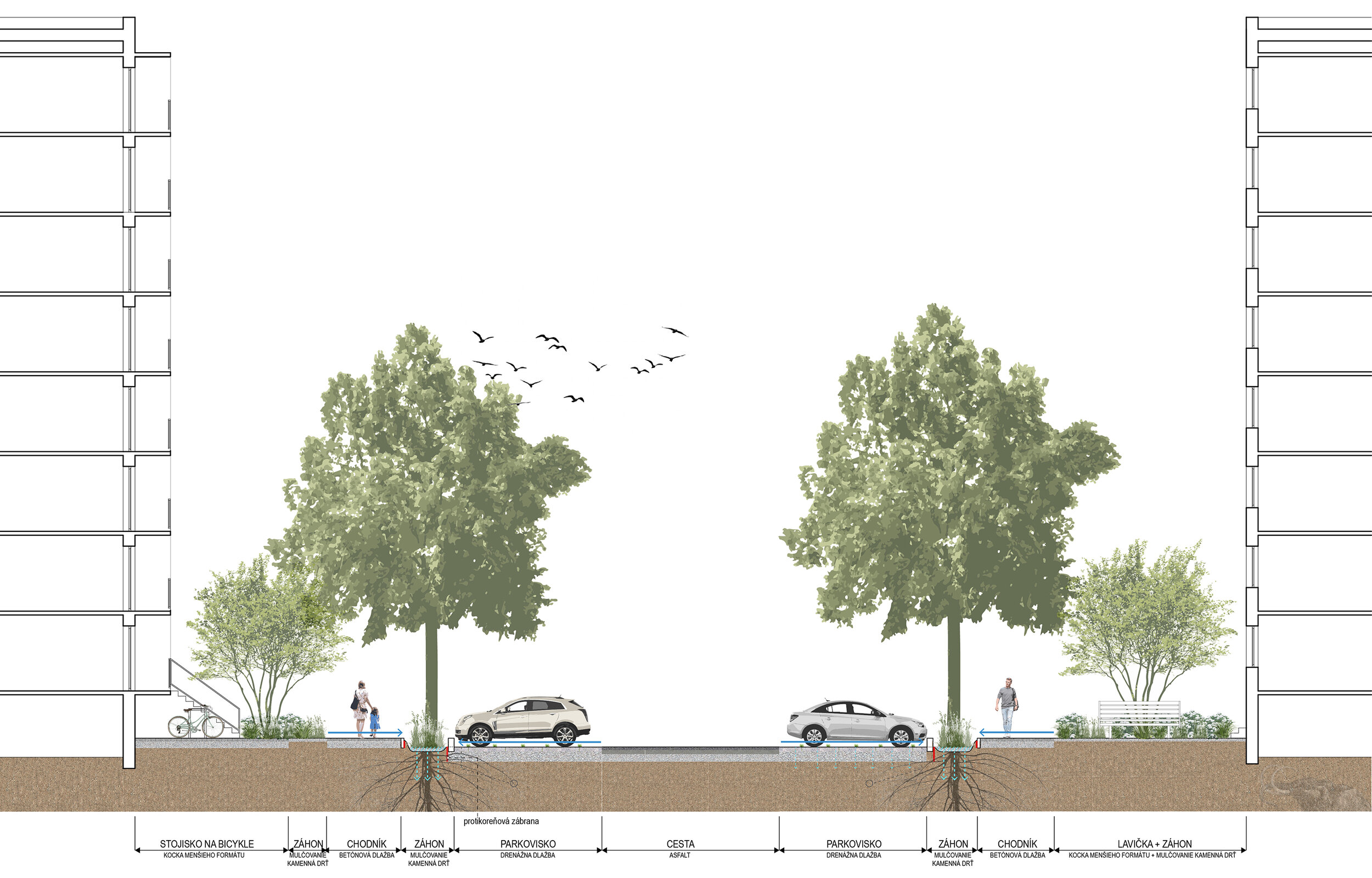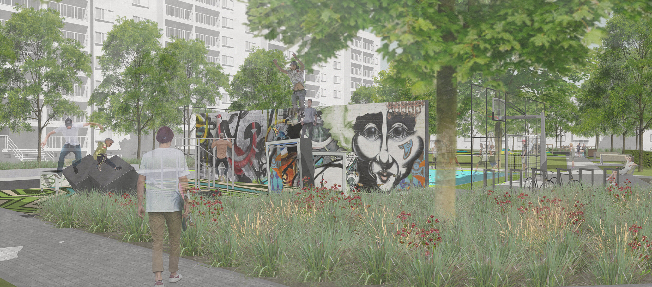 Návrh prevyšuje ostatné svojou prepracovanosťou koncepcie zelene. Každému dvoru je venovaná mimoriadna pozornosť. Autori sa venujú i okrajovým častiam, ktoré ostatní súťažiaci zanedbali. Navrhované plochy sú moderované konkrétnymi aktivitami. Obmena povrchov multifunkčných ihrísk je náznakom rôznosti dvorov. Každý z dvorov má veľmi podobnú paletu náplní, sú svojbytné, nezávislé na celku. Atmosféra ma všade rovnaké kvality. K pohybu po sídlisku núti iba príjemné centrum, ktorého potenciál autori využili. Energia vložená do dvorov, detailov a naplnení potrieb všetkých obyvateľov je enormná. Práve snaha o dokonalý kokteil v každom dvore porota vyhodnotila ako slabinu návrhu. Všetci majú celú paletu vo svojom dvore, rovnosť, nikam netreba chodiť, žiaden nie je špecifický. Vytráca sa napätie, prichádza pochybnosť, či ide o reálny svet. Priestory nenabádajú k obľúbenosti určitej skupiny.